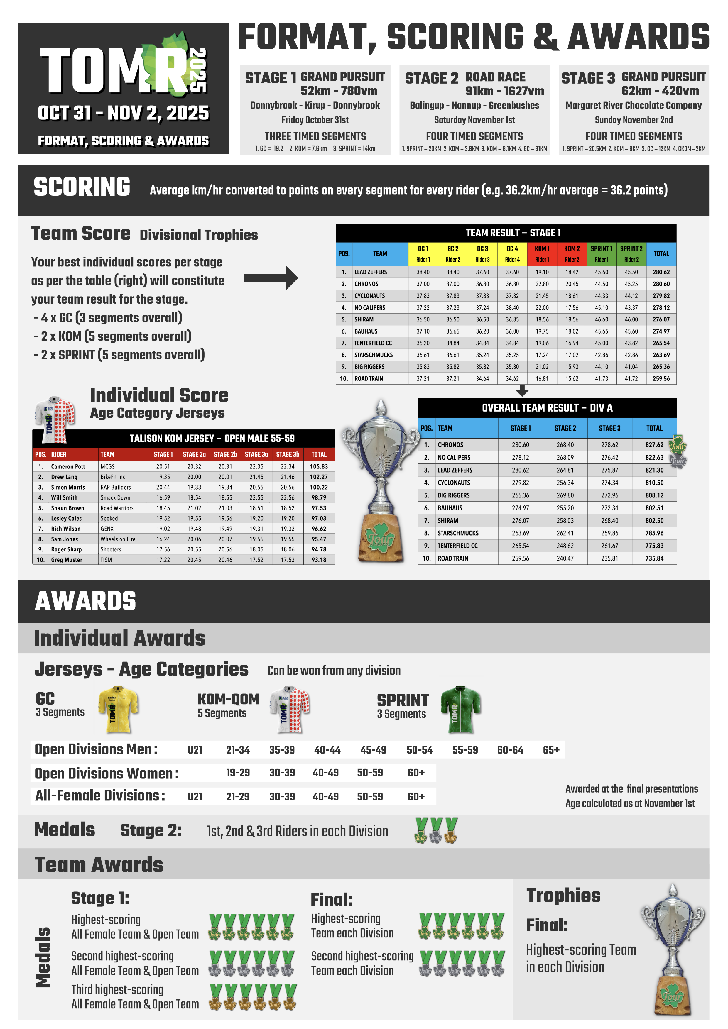 - Stage 2 Road Race: First, second and third riders in each division are awarded the TOMR Gold, Silver and Bronze Medals respectively.
